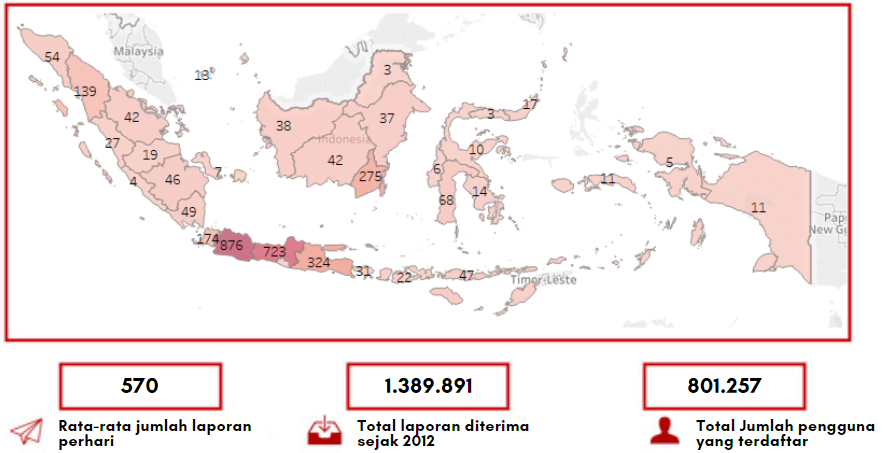 Jumlah pelapor per Januari 2019 adalah sebanyak 801.257 pengguna. Total laporan yang telah masuk sebanyak 1.389.891. Sumber laporan terbanyak melalui website diikuti oleh SMS, twitter dan aplikasi mobile
